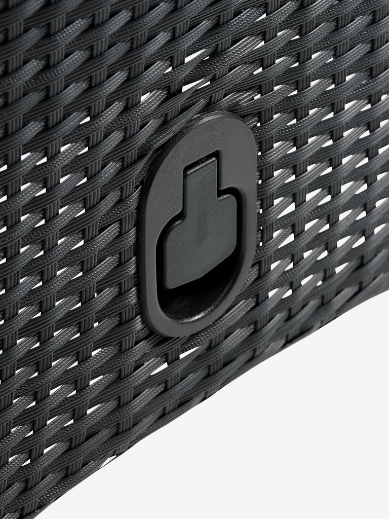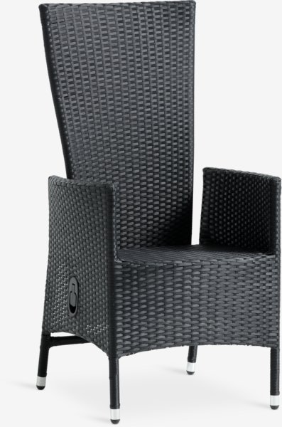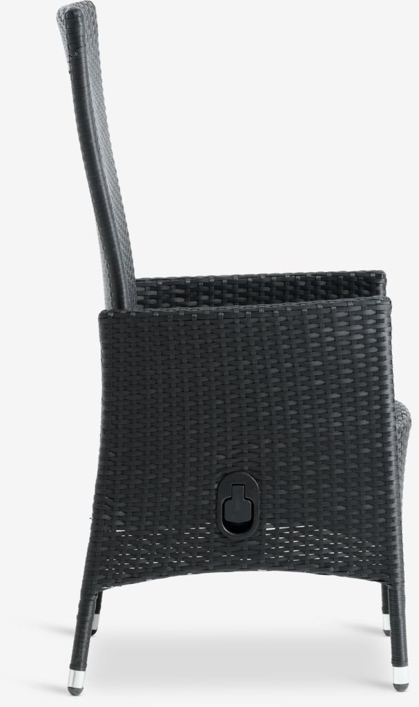 Crna podesiva stolica od petana sa okvirom od aluminijuma premazanog prahom. Baštenska stolica ima klizno podešavanje naslona, tako da možete lako pronaći najudobniji položaj za sedenje. Petan pruža prirodan izgled pruća, a istovremeno je otporan na vremenske uslove i ne zahteva održavanje. Aluminijum je lagan i robustan materijal koji ne rđa.