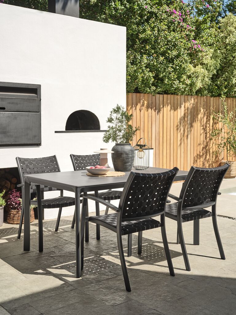 Baštenska garnitura za 4 osobe. Sto: aluminijum i keramika. Ploča stola od keramike otporna je na ogrebotine, mrlje i toplotu. Š95xD150xV74 cm. Stolice: aluminijum i polipropilen. Mogu da se slažu jedna na drugu.