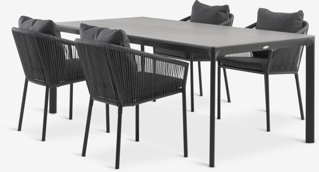Baštenska garnitura za 4 osobe. Sto: aluminijum i sinterovani kamen. Ploča stola od sinterovanog kamena otporna je na ogrebotine, mrlje i toplotu. Š95xD200xV74 cm. Stolice: aluminijum i poliester. Sa luksuznim jastucima sa grubo tkanom navlakom koja se brzo suši. Mogu da se slažu jedna na drugu.