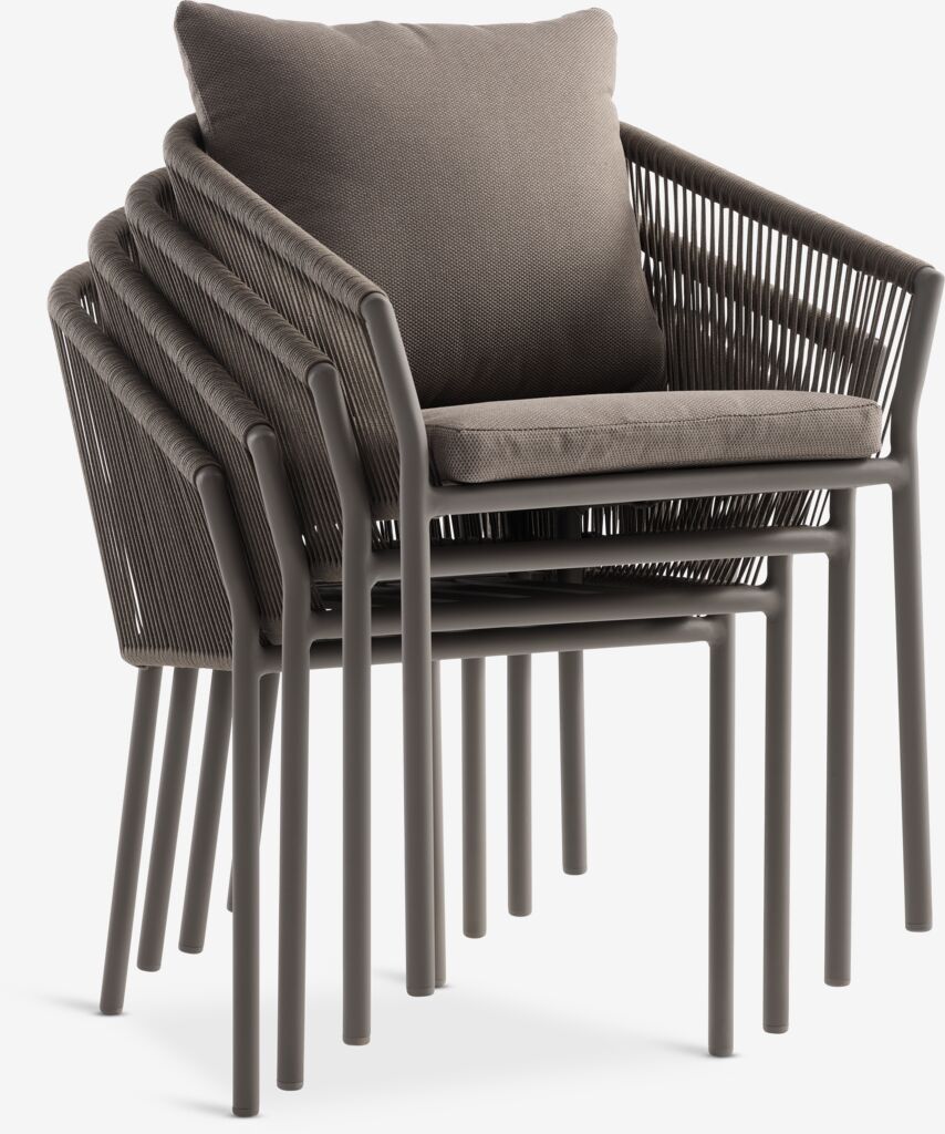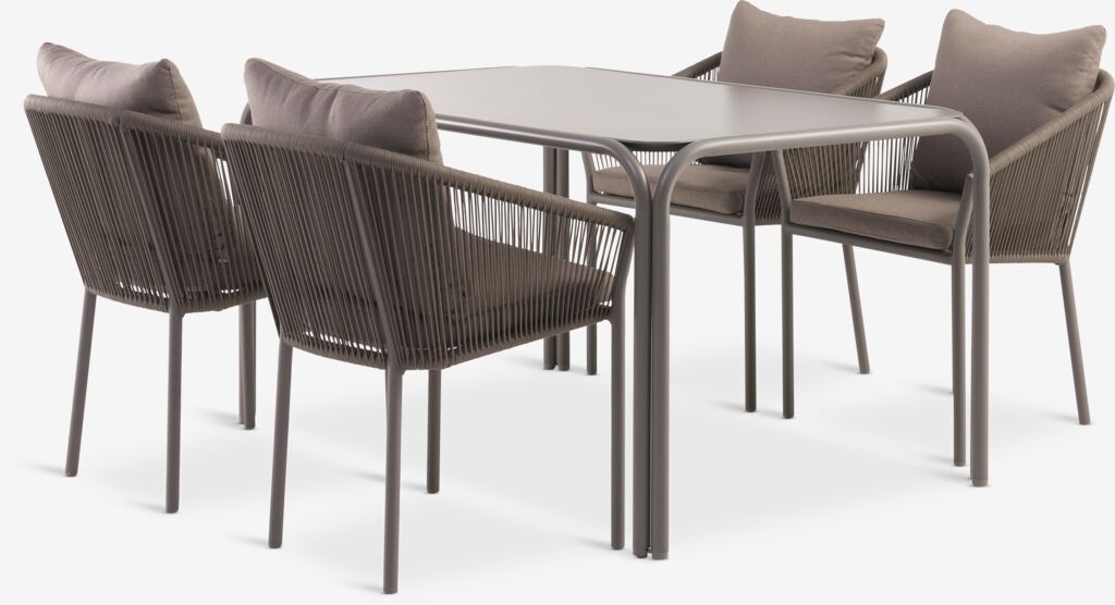 Baštenska garnitura za 4 osobe. Sto: čelik i kaljeno staklo. Š90xD140xV74 cm. Stolice: aluminijum i poliester. Sa luksuznim jastucima sa grubo tkanom navlakom koja se brzo suši. Mogu da se slažu jedna na drugu.