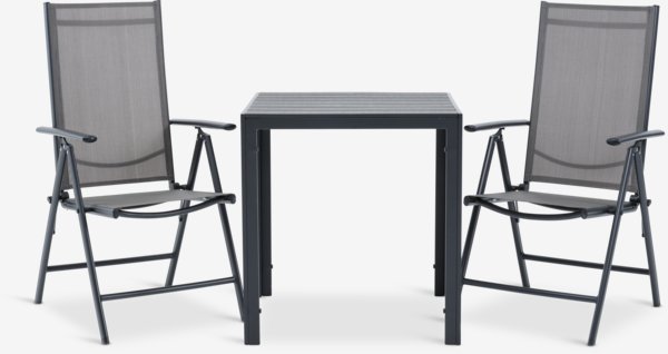 Bistro garnitura za 2 osobe. Sto: aluminijum i veštačko drvo. Š70xD70xV74 cm. Stolice: aluminijum i tekstilen. 7 položaja. Sklopive.