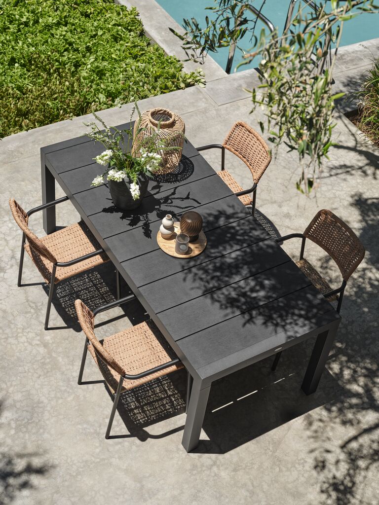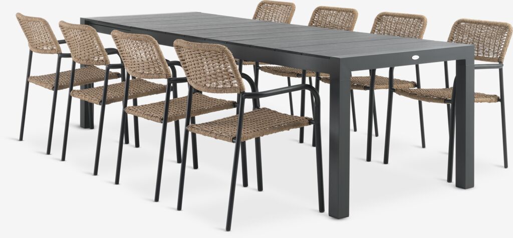 Baštenska garnitura za 4 osobe. Sto: aluminijum i veštačko drvo. Sa 1 dodatnim krilom koje se može podvući ispod ploče stola. Š95xD208/272xV76 cm. Stolice: čelik i petan. Mogu da se slažu jedna na drugu.