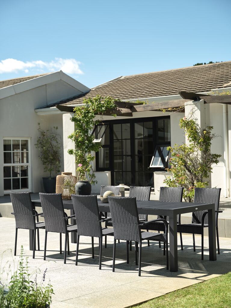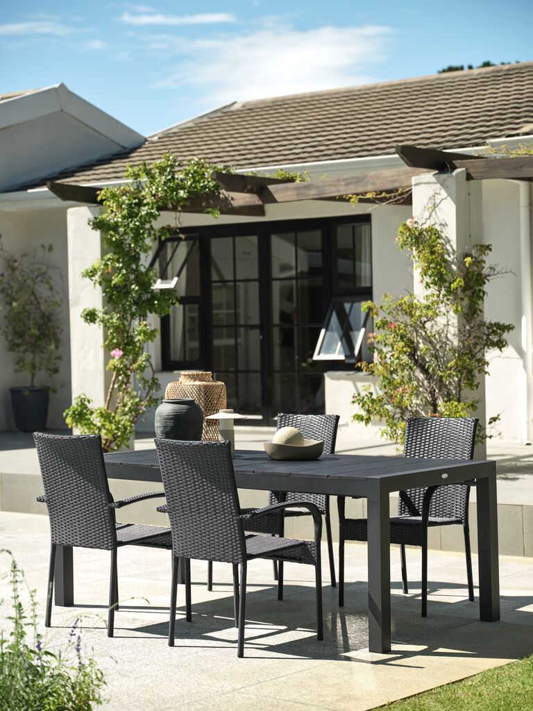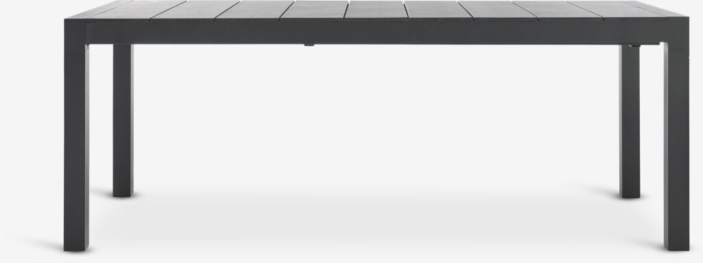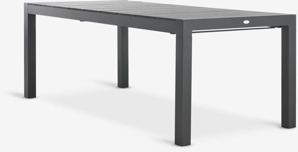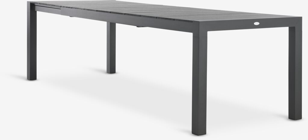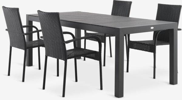 Baštenska garnitura za 4 osobe. Sto: aluminijum i veštačko drvo. Sa 1 dodatnim krilom koje se može podvući ispod ploče stola. Š95xD208/272xV76 cm. Stolice: čelik i petan. Mogu da se slažu jedna na drugu.