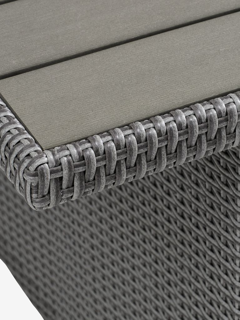 Lounge sto ima ploču od veštačkog drveta. Ima izgled i teksturu prirodnog drveta, bez potrebe za održavanjem. Napravljeno je od plastike, kao što je polistiren, koja formira izdržljiv materijal. Veštačko drvo je otporno na vremenske uslove, što znači da može izdržati izloženost suncu, vlazi i promenama temperature. Izbegavajte stavljanje staklenih predmeta direktno na sunce na ploči od veštačkog drveta, jer to može izazvati tragove sagorevanja i promenu boje.