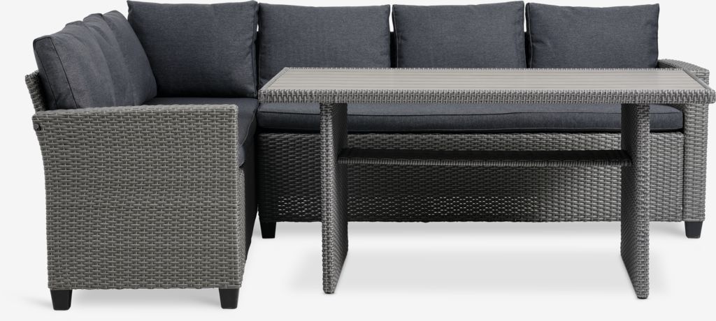 Opustite se u svom spoljašnjem prostoru uz AGERMOSE lounge garnituru. Ova siva garnitura za 6 osoba sastoji se od ugaone sofe sa udobnim jastucima i odgovarajućeg lounge stola sa pločom od veštačkog drveta.