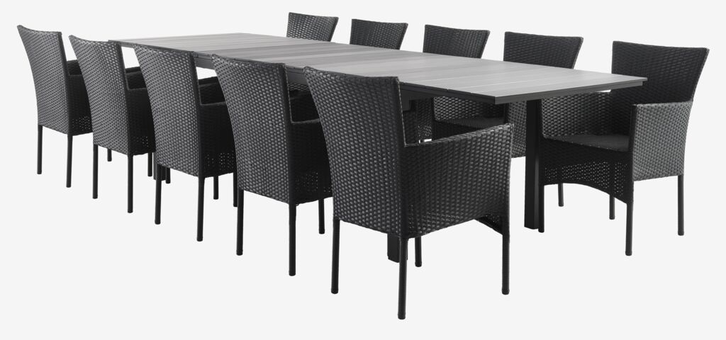 Baštenska garnitura za 4 osobe. Sto: aluminijum i DURAWOOD® kompozitno drvo. DURAWOOD® je dugotrajni kompozitni materijal od vlakana FSC™ tvrdog drveta i plastike. Sa 2 dodatna krila koja se mogu podvući ispod ploče stola. Š95xD214/265/315xV77 cm. Stolice: čelik i petan. Mogu da se slažu jedna na drugu.