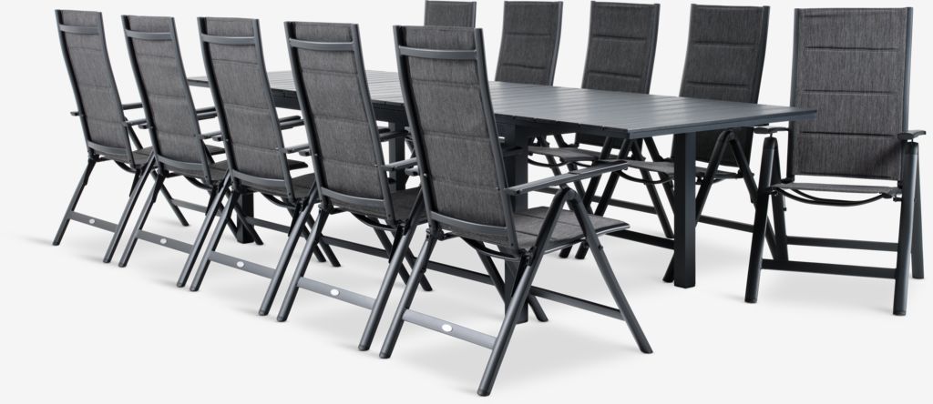 Baštenska garnitura za 4 osobe. Sto: aluminijum i veštačko drvo. Sa 2 dodatna krila koja mogu da se podvuku ispod površine stola. Š95xD206/263/319xV76 cm. Stolice: aluminijum, tekstilen i punjenje od pene koja se brzo suši. 6 položaja. Sklopive.