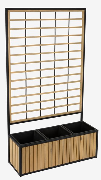 Saksija sa rešetkom, napravljena od nauljenog FSC® tvrdog drveta, galvanizovanog čelika i plastike. Idealna za stvaranje zelene ograde oko vaše terase ili za podelu vašeg otvorenog prostora. Rešetka pruža podršku za penjačice, a kada je pokrivena, daje prelep i dekorativan efekat. Otvor za drenažu vode se lako može napraviti kako bi se osiguralo da višak vode može da se ocedi. Š27 x D74 x V131 cm