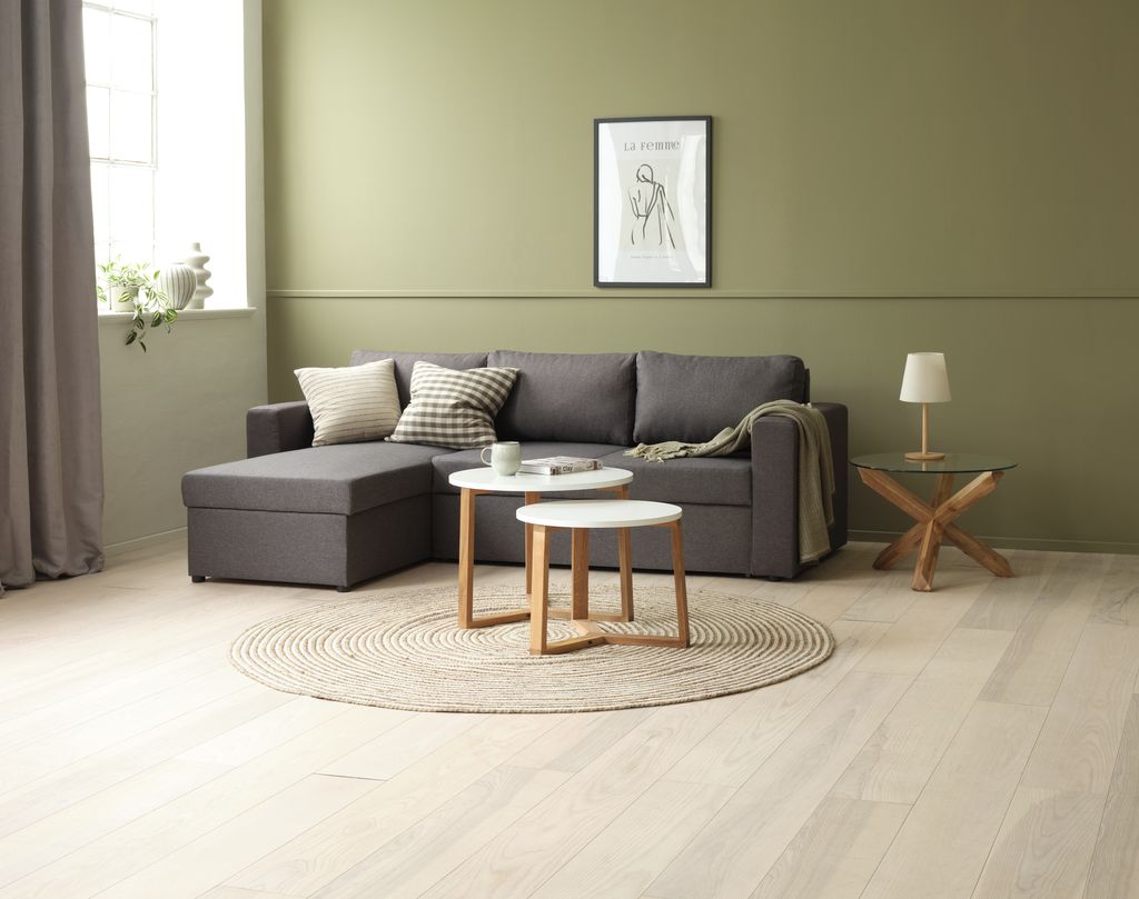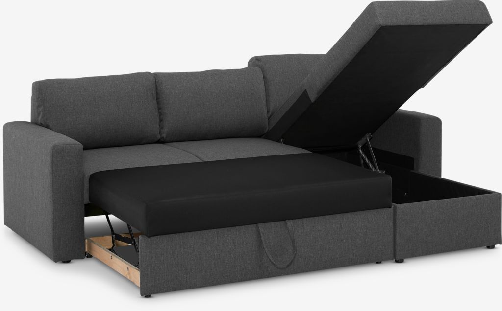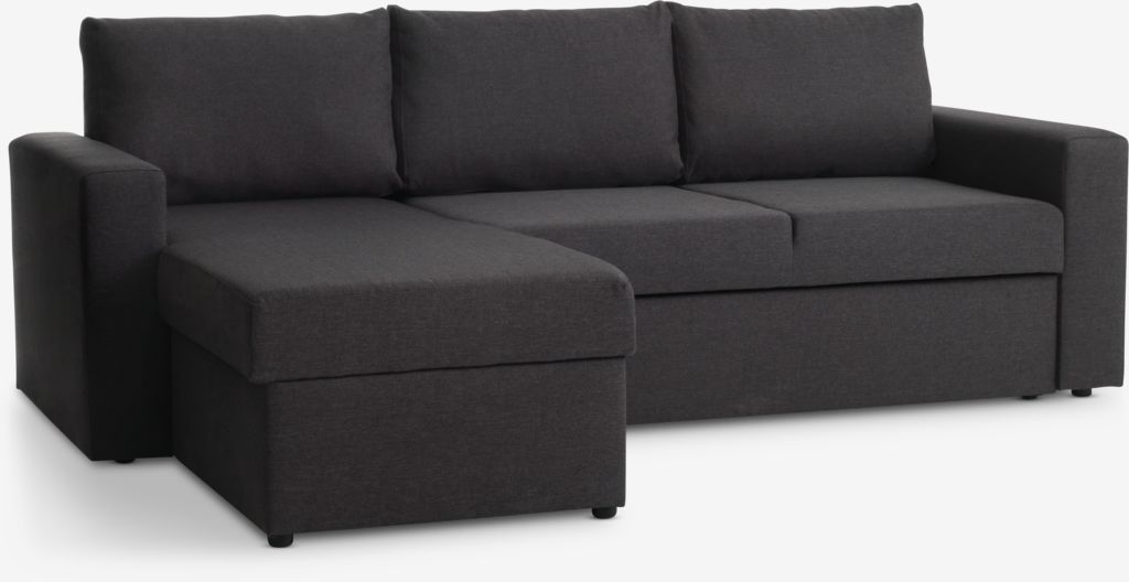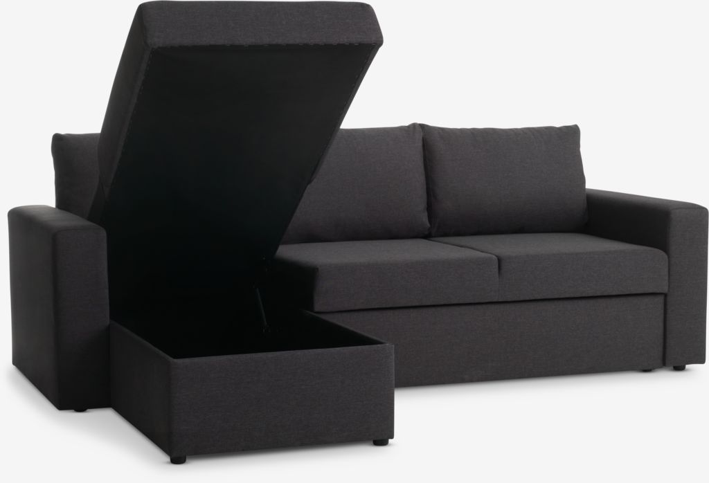 Trosed od tkanine sa lenjivcem. Lako se razvlači u krevet. Sedište i naslon od pene. Sa prostorom za odlaganje. Levi ili desni ugaoni deo. Površina za spavanje: 140x195 cm. Š230xV83xDub88/150 cm