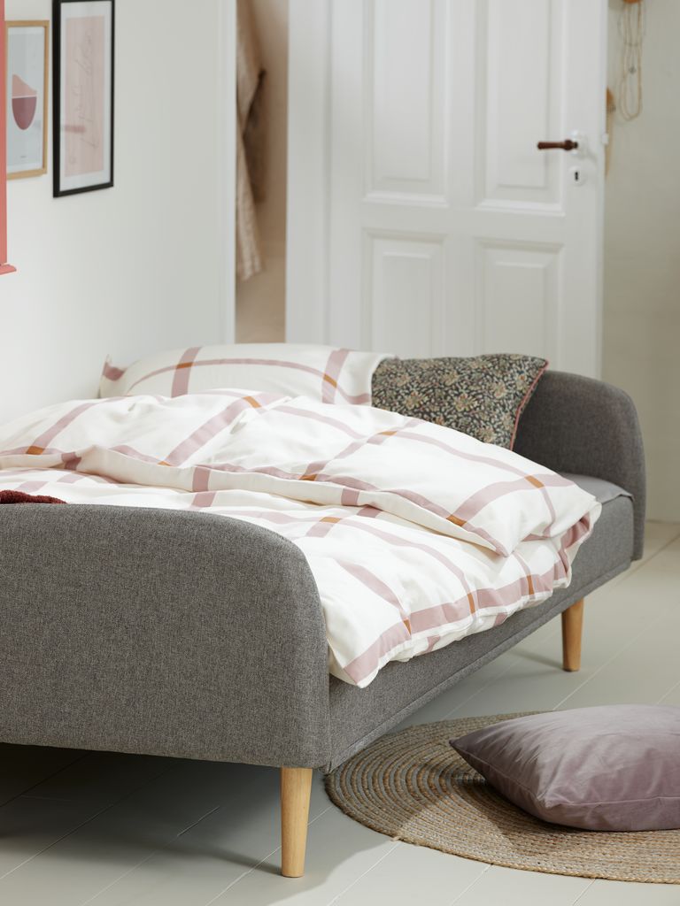 Sofá-cama com material bonito e bem feito, não é muito confortável é um pouco duro mas pelo preço não se pode pedir muito. Faz a sua função como cama perfeitamente, ideal para quem uma sala pequena.
