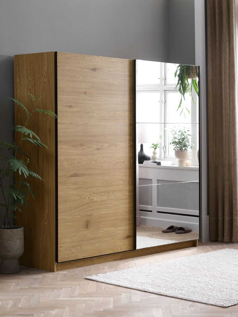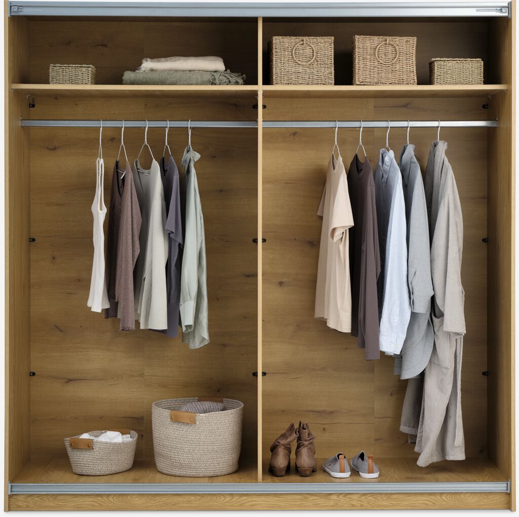 Ukrasni furnir. Sa kliznim vratima. Unutrašnjost ormara: 2 police i 2 nosača za vešalice. Š200xV200xDub64 cm
