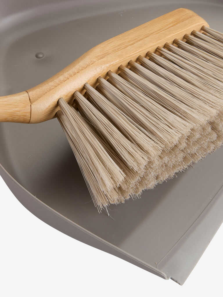 Đubrovnik i metlica sa drškom od bambusa. Sivi đubrovnik ima gumenu ivicu za efikasno čišćenje. Metlica se uklapa u đubrovnik radi kompaktnog odlaganja i ima omču od kanapa za kačenje. Š25xD35xV9 cm