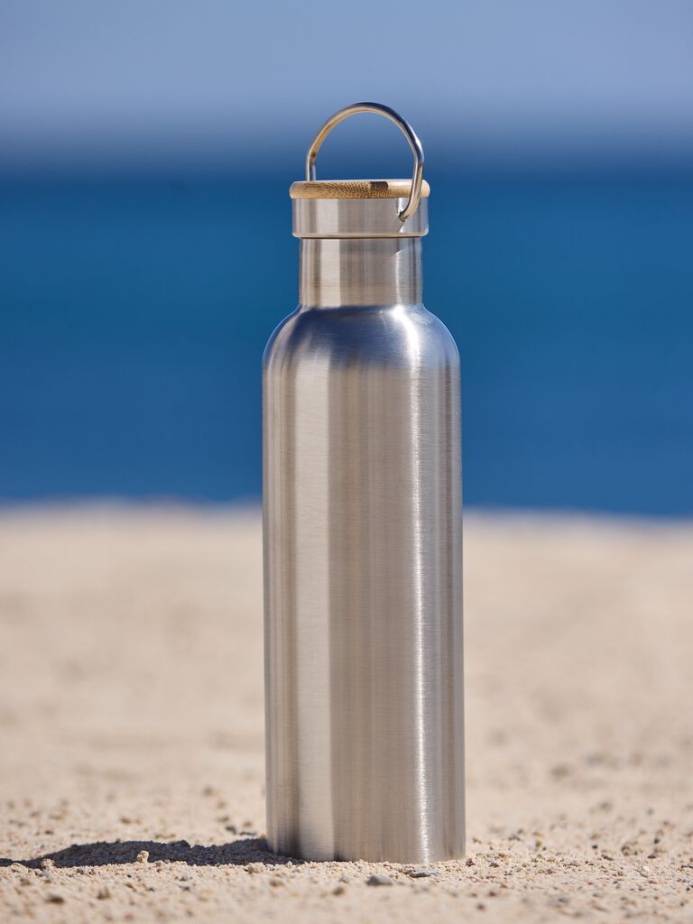 Termos flaša od brušenog nerđajućeg čelika, idealna za održavanje toplih ili hladnih napitaka dok ste u pokretu. Ima bambusov poklopac sa praktičnom ručkom za nošenje i kapacitet od 75 cl. Ø8xV26 cm
