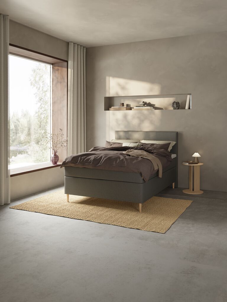 Beställde denna mörkgrå sänggavel istället för en i samma färg som sängen eftersom jag tycker det är snyggt med kontrasten. Den passar väldigt bra och står stadigt med sängen som stabilt stöd.